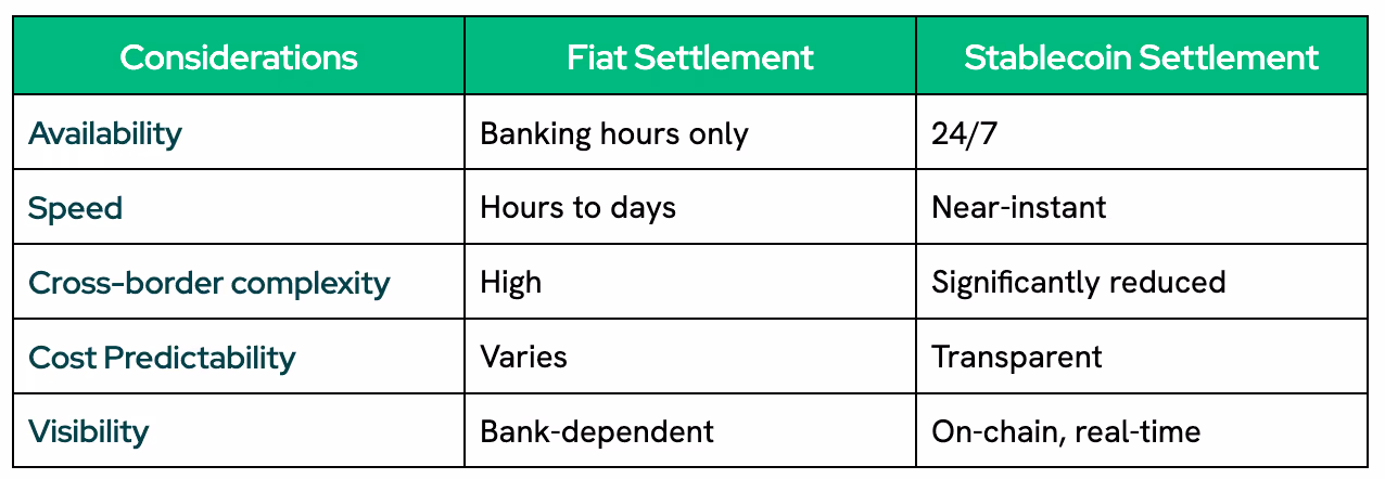 For business owners, CFOs, and finance ops leaders, stablecoin settlement is less about replacing fiat, and more about complementing it.
