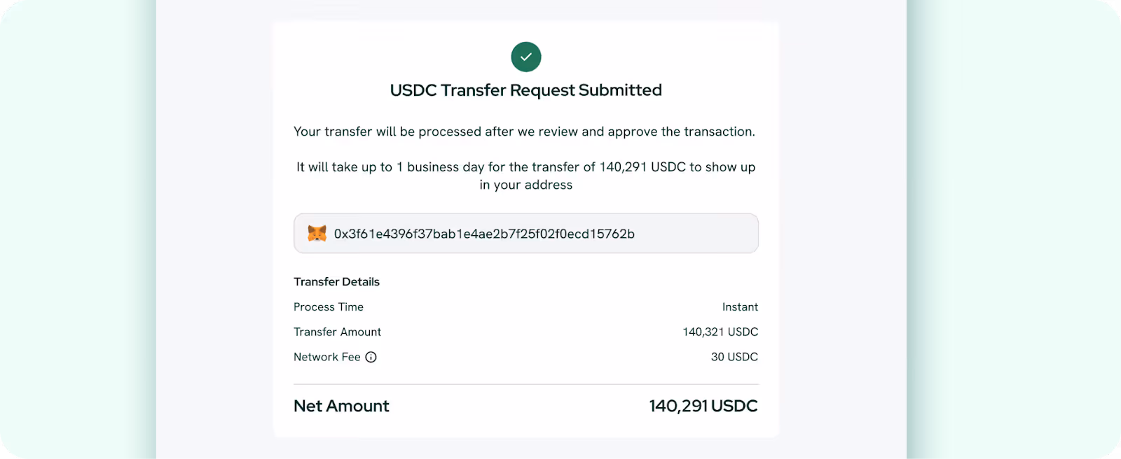 - You will receive an email once your funds have been credited and converted to the stablecoin of choice at a 1:1 rate, with network transaction fees applied.