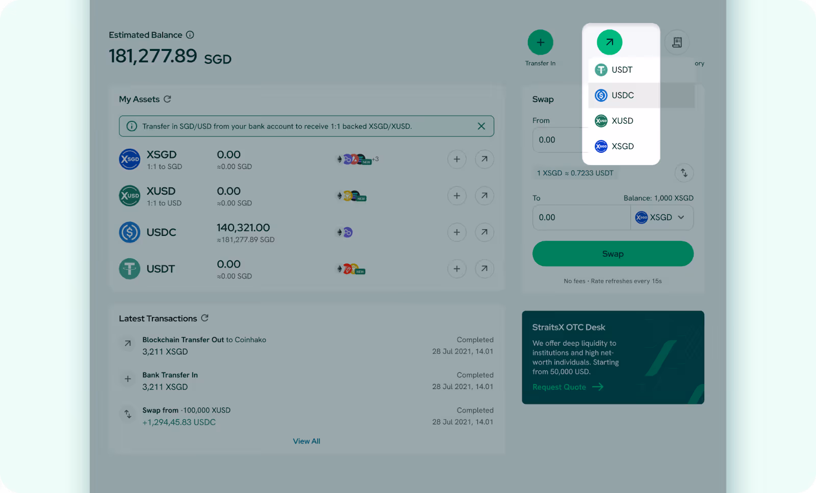 After you have USDC in your dashboard, you can swap it for another supported stablecoin such as XUSD, XSGD or USDT. Here’s how you do it: