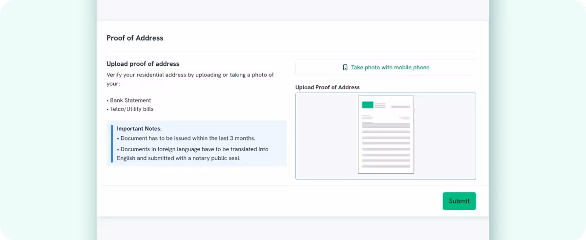 7. To verify your address, please upload an official document dated within the last 3 months that includes your full name and residential address (e.g., utility or telco bill, bank statement). Documents in languages other than English must be translated and notarized.