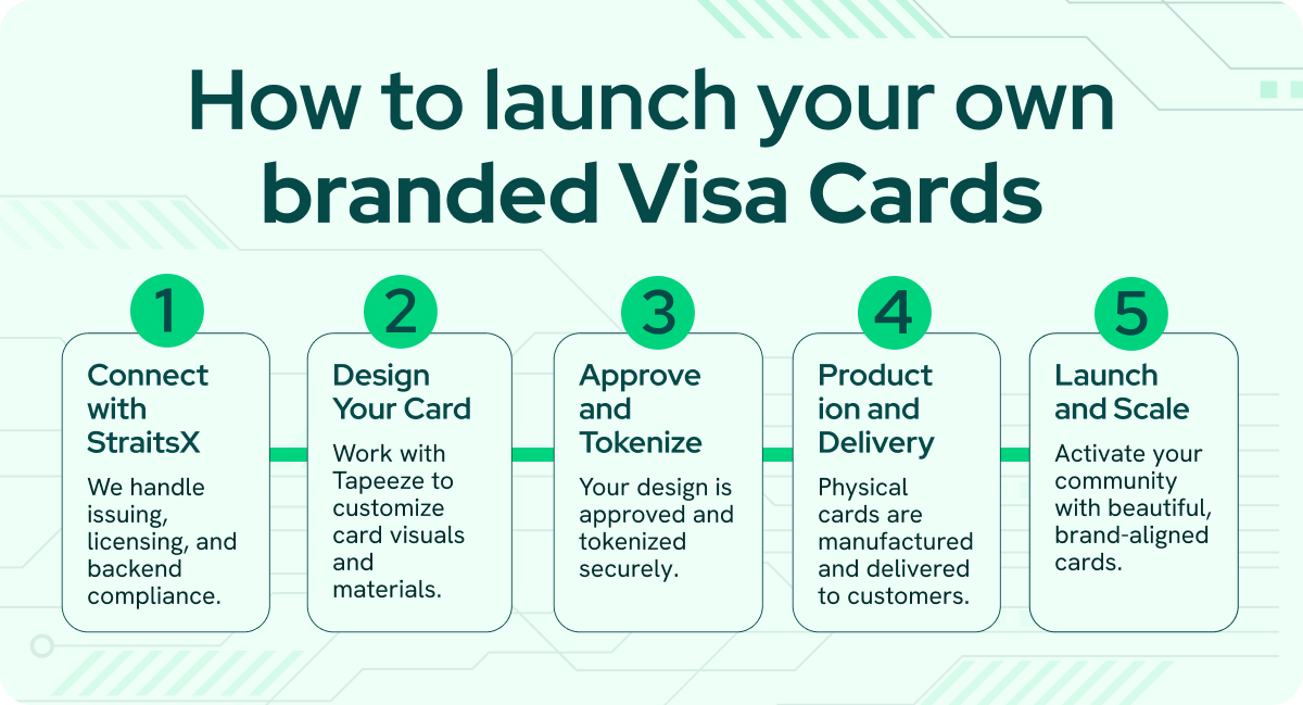 Launching your own branded Visa card has never been simpler. The flow below demonstrates how StraitsX and Tapeeze manage the complexity, allowing you to focus purely on your brand.