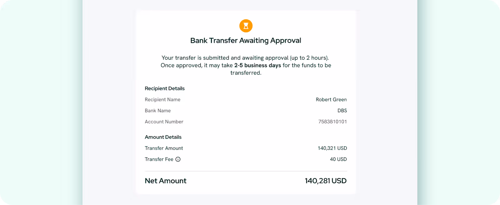 - You will receive an email once your funds are credited to your bank account. Note: A USD 40 transaction fee applies to all USD transfers.