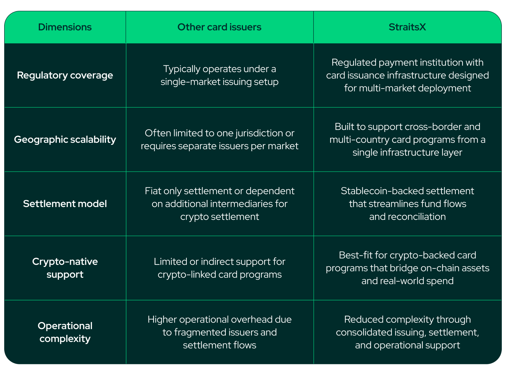 Unlike traditional card setups that rely on siloed fiat settlement and market-specific issuers, StraitsX combines licensed payment infrastructure with stablecoin settlement to streamline how funds move across card rails. This enables faster reconciliation, clearer fund flows, and a more scalable operating model across markets.